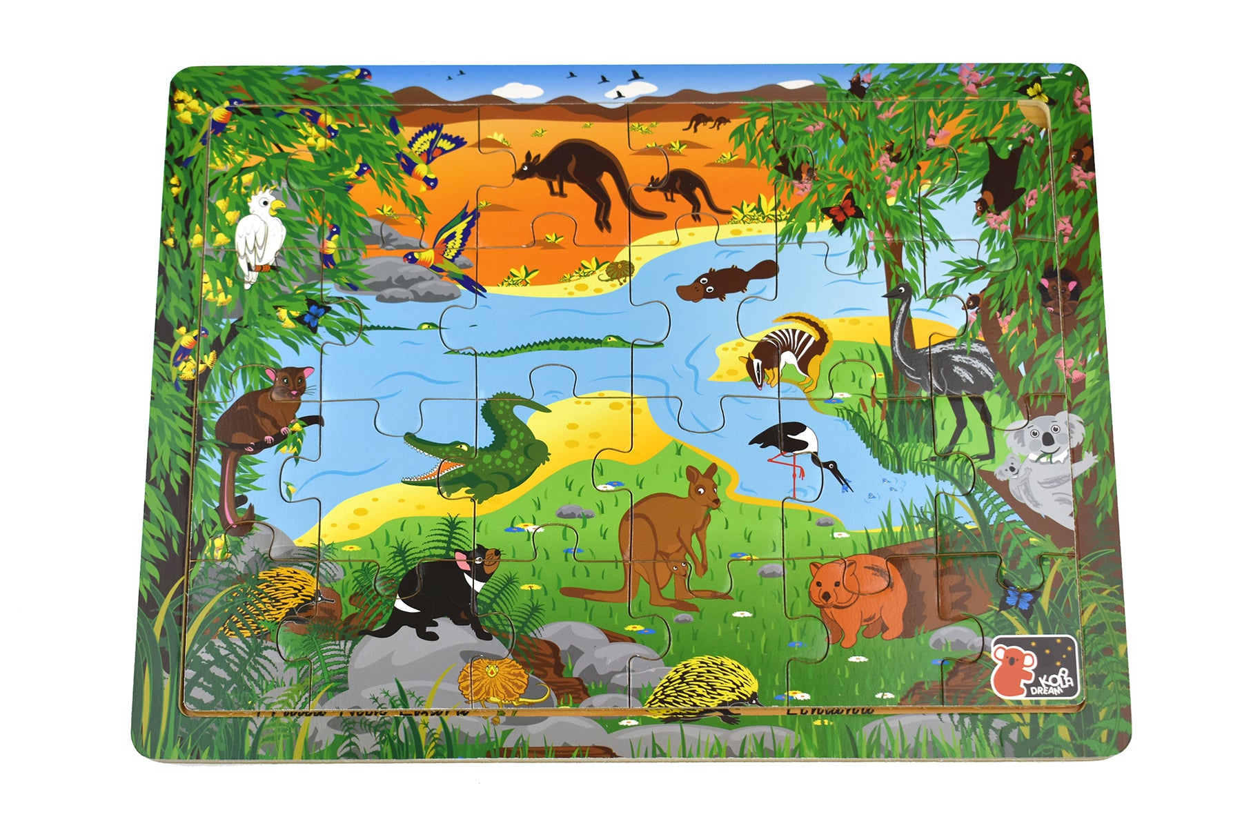 The 24 Piece Puzzle Board Australian Animals by Koala Dream is a beautifully crafted wooden jigsaw puzzle featuring vibrant colours. This puzzle introduces children to a variety of Australian animals, showcasing the unique wildlife found in Australia.