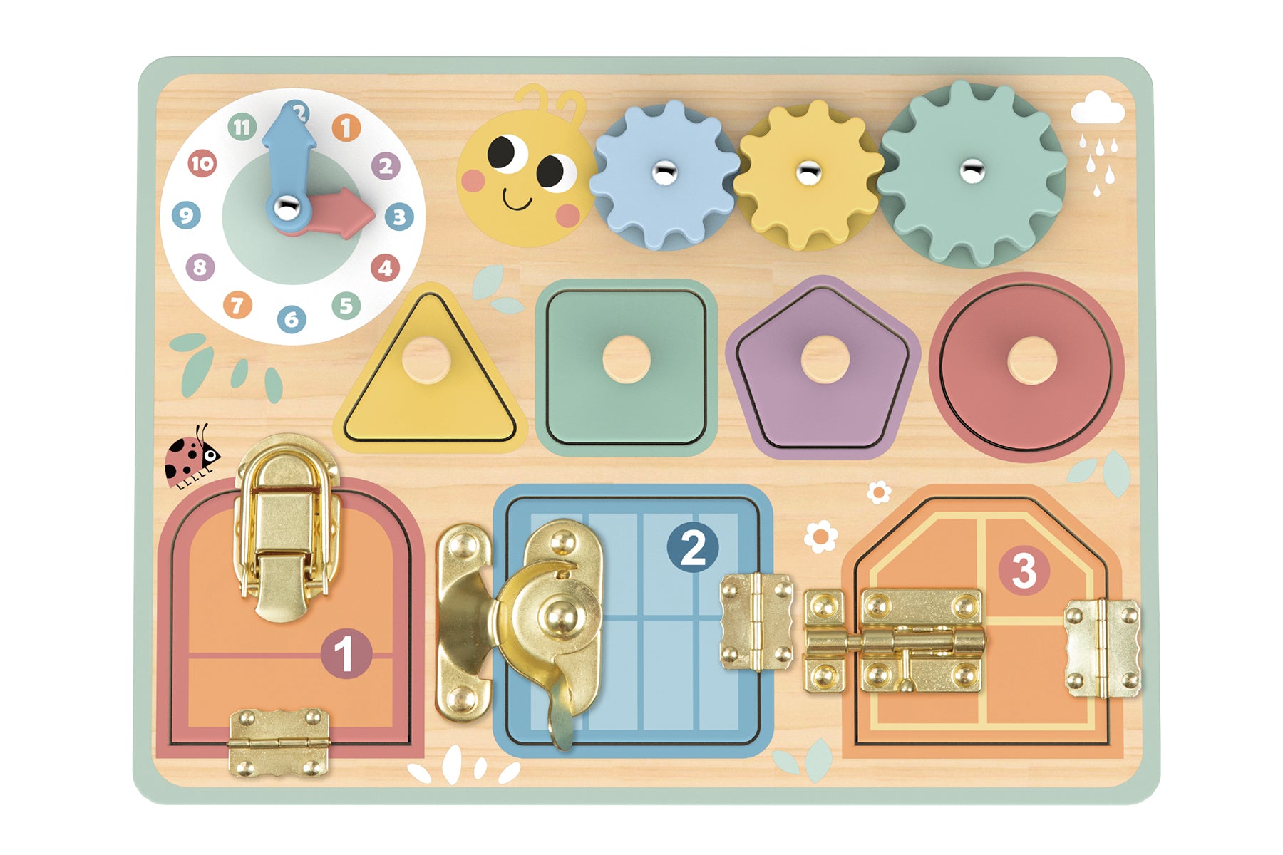 But the fun doesn't stop there! Little ones can also explore shape sorting with the four-piece sorter, turning cogs for tactile stimulation, and moving the hands on the clock to learn about time and numbers. Each activity on the busy board presents a new learning opportunity, stimulating cognitive development and fostering early educational skills.