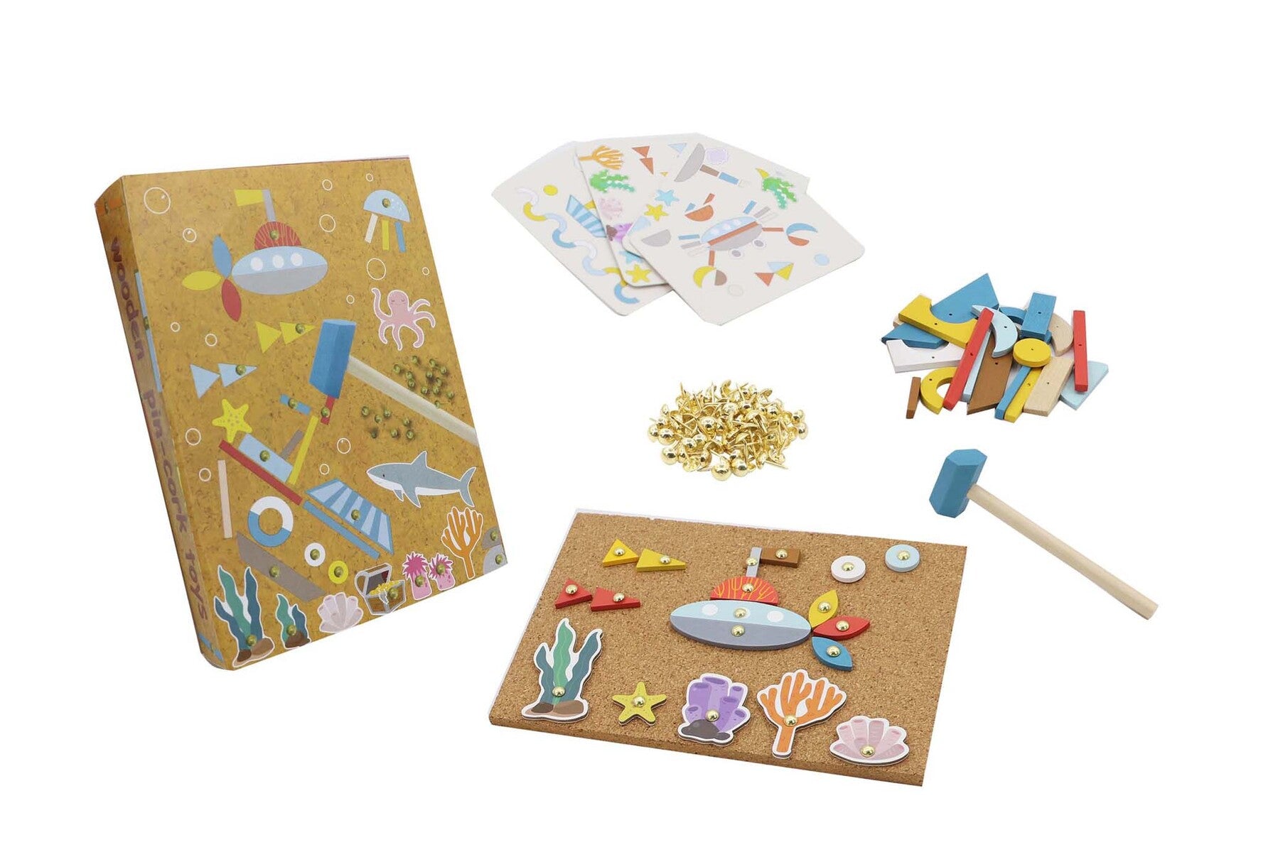 Dive into a world of artistic exploration with the Wooden Underwater World Tap a Shape Set from Kaper Kidz. This classic construction set provides an immersive and hands-on experience, allowing you to tap and create your very own underwater masterpiece. Unleash your creativity and enhance hand-eye coordination as you follow these simple steps: -Choose one of the four pattern cards included in the set. Each card serves as a muse for your underwater world design. -Place the cork board on a flat surface. This will be your canvas, ready to capture the essence of your imaginative creation. - Explore your creativity by arranging the 71 wooden shapes provided. From fish to seaweed, the assortment allows you to design a diverse underwater landscape. - Take the provided wooden hammer and 80 nails to tap the 18 sturdy card underwater animals onto the cork board. Feel the satisfaction as your underwater scene comes to life with added depth and dimension. - Let your imagination run wild as you continue to tweak and modify your underwater world. The flexibility of the wooden shapes ensures that every creation is uniquely yours. -Once your masterpiece is complete, neatly store the set in its book-style package, keeping all components organized and ready for your next artistic adventure. With this comprehensive Tap a Shape Set, not only do you get the joy of crafting a visually stunning underwater world, but you also develop fine motor skills and creative thinking. Dive into the ocean of possibilities with the Wooden Underwater World Tap a Shape Set, where each tap is a step towards an imaginative and skill-enhancing masterpiece.